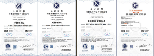 2019年,“森林樹” 家具通過了1S090001、IS014001質量環境管理體(ti) 係認證: GB/T 2800- -2011職業(ye) 健康安全管理體(ti) 係認證: