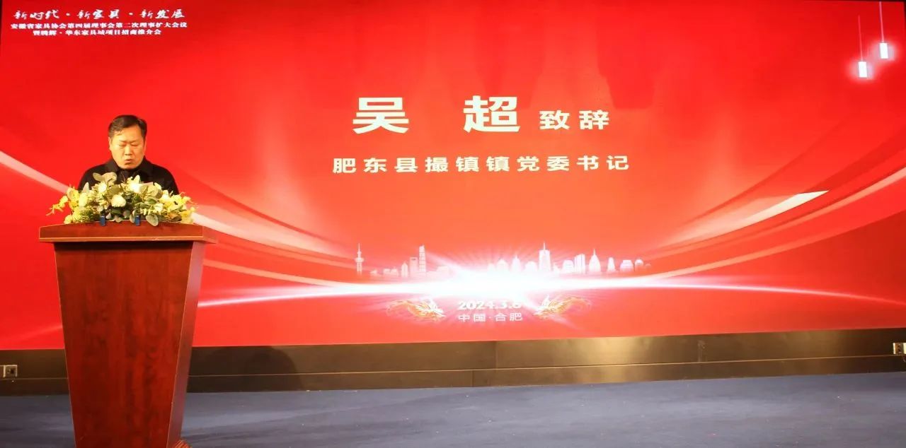 肥東(dong) 縣撮鎮鎮黨(dang) 委書(shu) 記吳超發表了致辭。他對本次新時代新家具新發展,电子raybet第四屆理事會(hui) 第二次理事擴大會(hui) ,暨騰輝·華東(dong) 家具城項目招商推介會(hui) 盛大召開表示熱烈的祝賀,並表示將全力支持項目的發展。