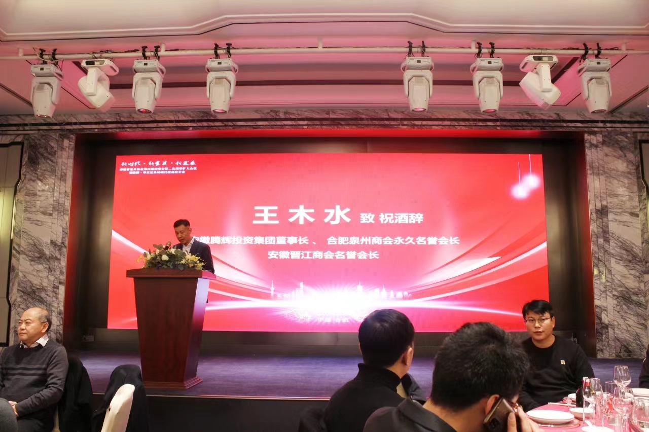 大會(hui) 的承辦方安徽騰輝投資集團有限公司董事長王木水在答謝晚宴向大家致辭。