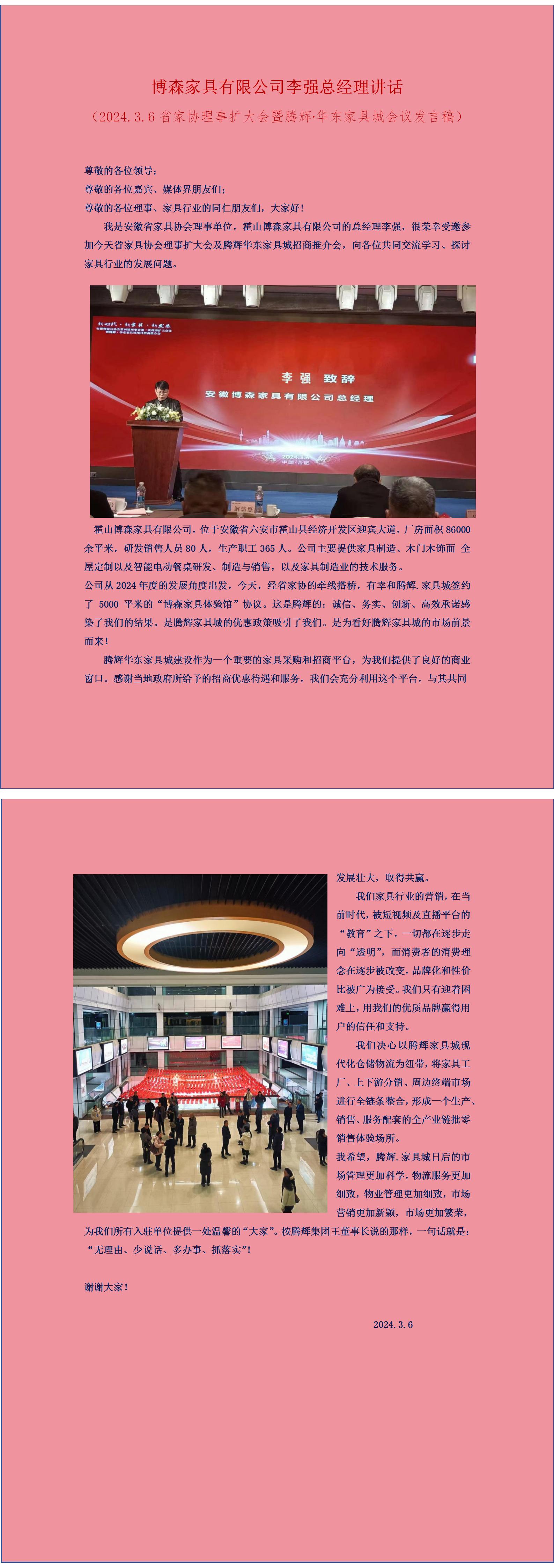 2024.3.6省家協理事、博森家具有限公司總經理李強在四屆理事會第二次理事擴大會暨騰輝·華東家具城項目招商推介會入駐企業簽約儀式上的講話
